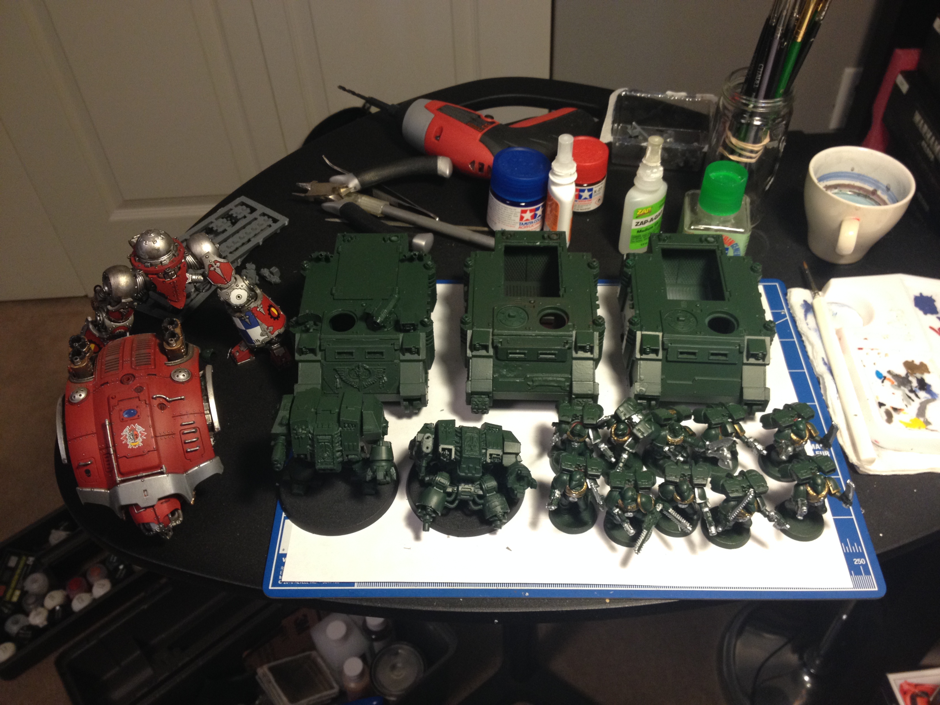 All have been primed Caliban green and are waiting to be completed this week, when the other Rhino (for the 1st Veteran Squad) and dreadnought (to complete the lance) will arrive.