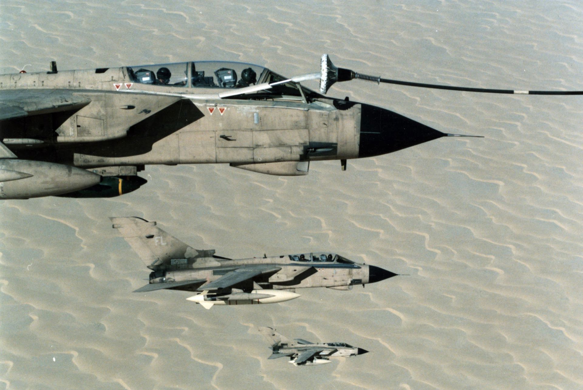 On the opening night of Operation Desert Storm, RAF Tornado GR.1s—including aircraft from No. 16 Squadron—executed low-level attacks using the JP233 runway denial system. These missions were flown at tree-top height, under heavy anti-aircraft fire, to crater Iraqi airfields and scatter anti-personnel bomblets.