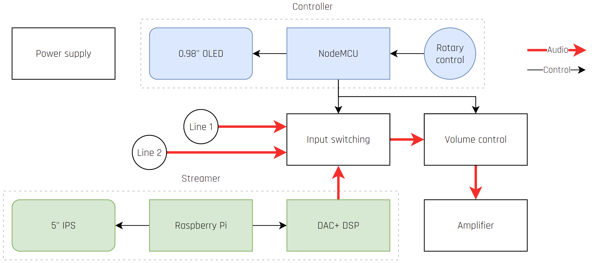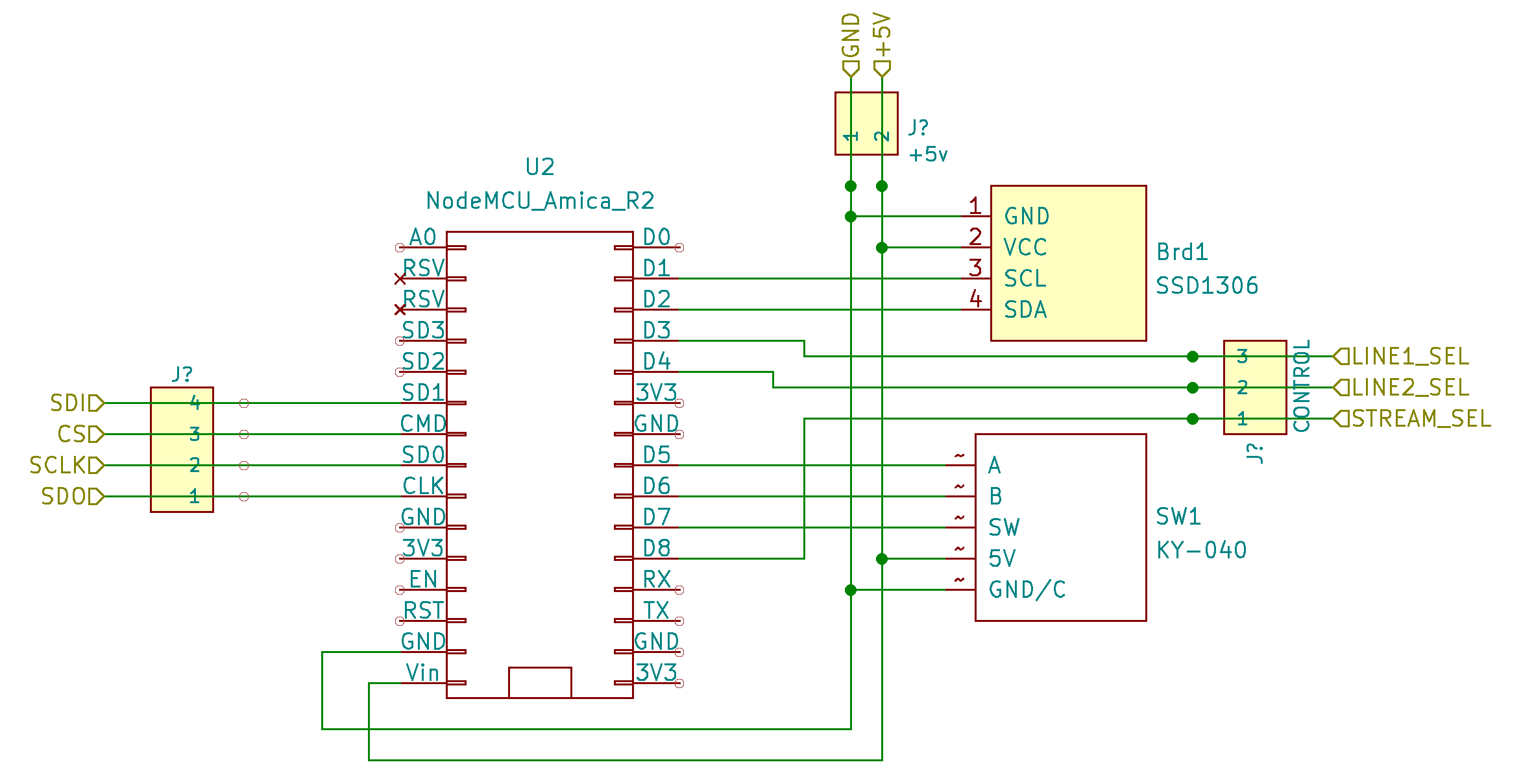 The controller module is build around a NodeMCU dev kit, using a KY-040 rotary encoder as its only input mechanism and driving a 0.98" OLED display to show the UI. The separate screen, in addition to the streaming module one, is necessary in those scenarios where music is played from one of the two line in sources.