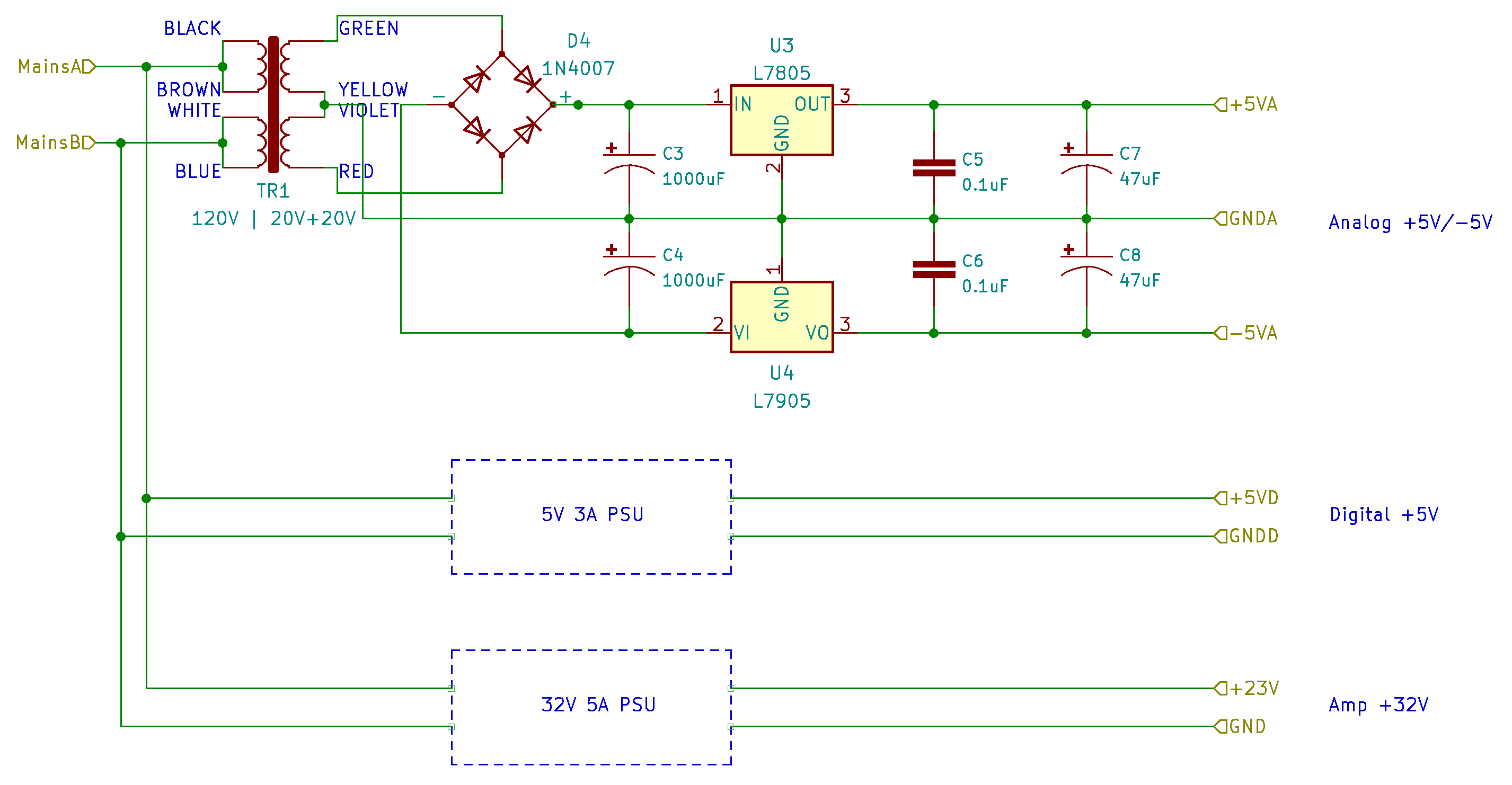 The circuit is quite straightforward, using a LM7805 for the +5V rail, a LM7905 for the -5V rail, and a LM7812 for the +12 V. There's really not much to it, but in future revisions I might try to separate the rails that go to digital and analog modules, to separate the ground planes and minimize interference.